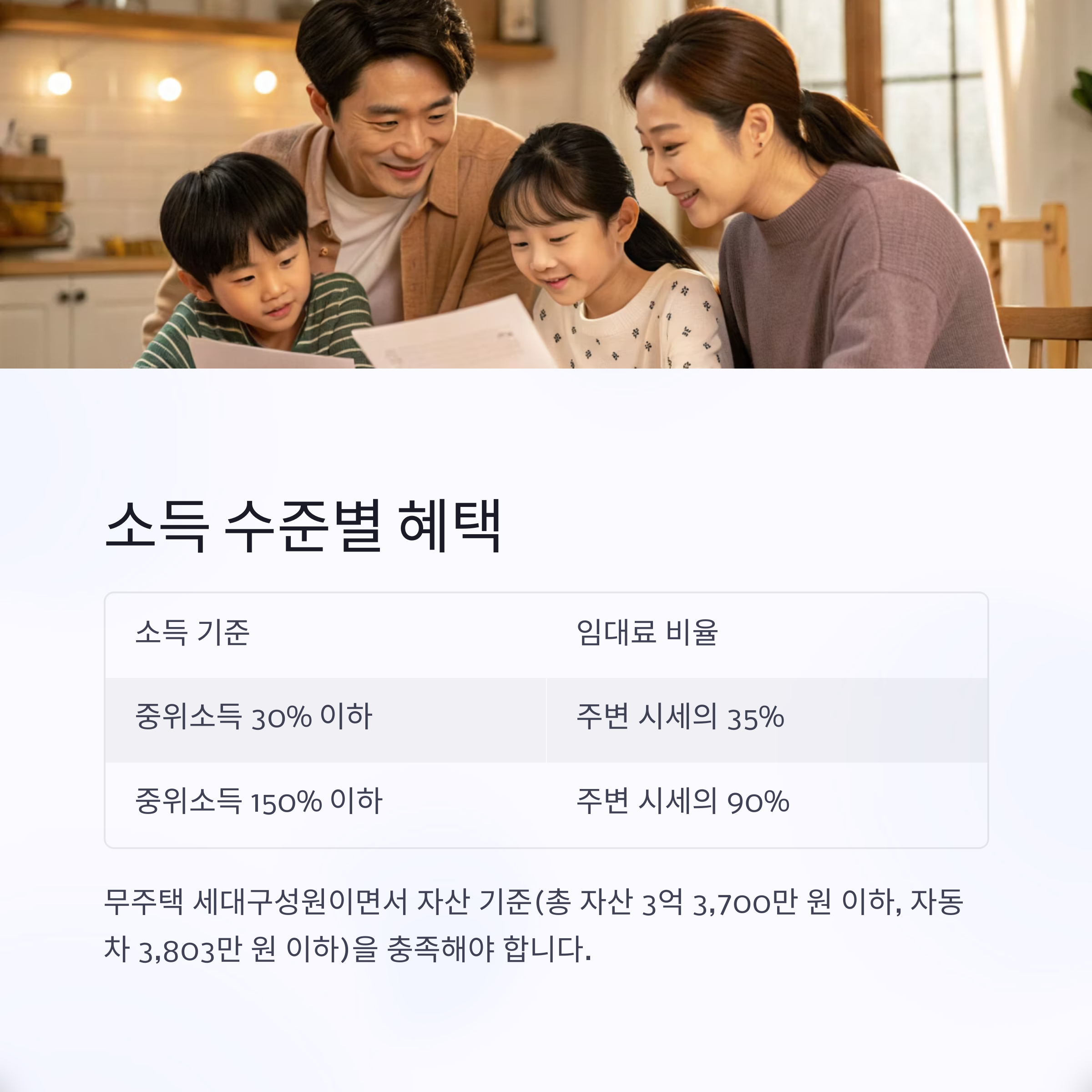 무주택 세대구성원이면서, 기준 중위소득 30% 이하라면 비교적 저렴한 임대료 혜택을 받을 가능성이 높습니다.