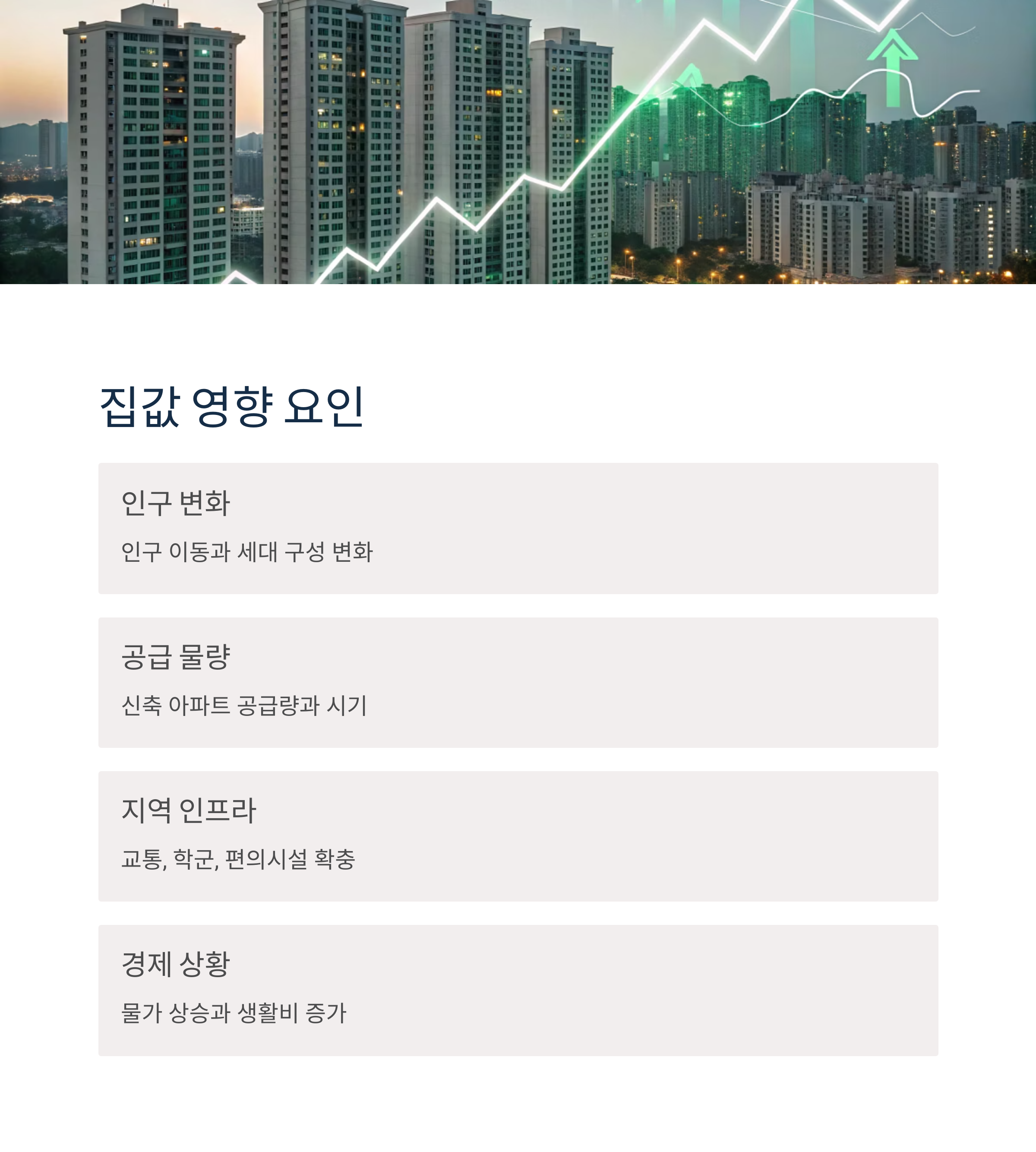 경제 사정과 지역별 선호도 역시 주요 변수로 꼽히며, 특히 대도시와 지방의 집값은 상반된 움직임을 보일 때가 많습니다.