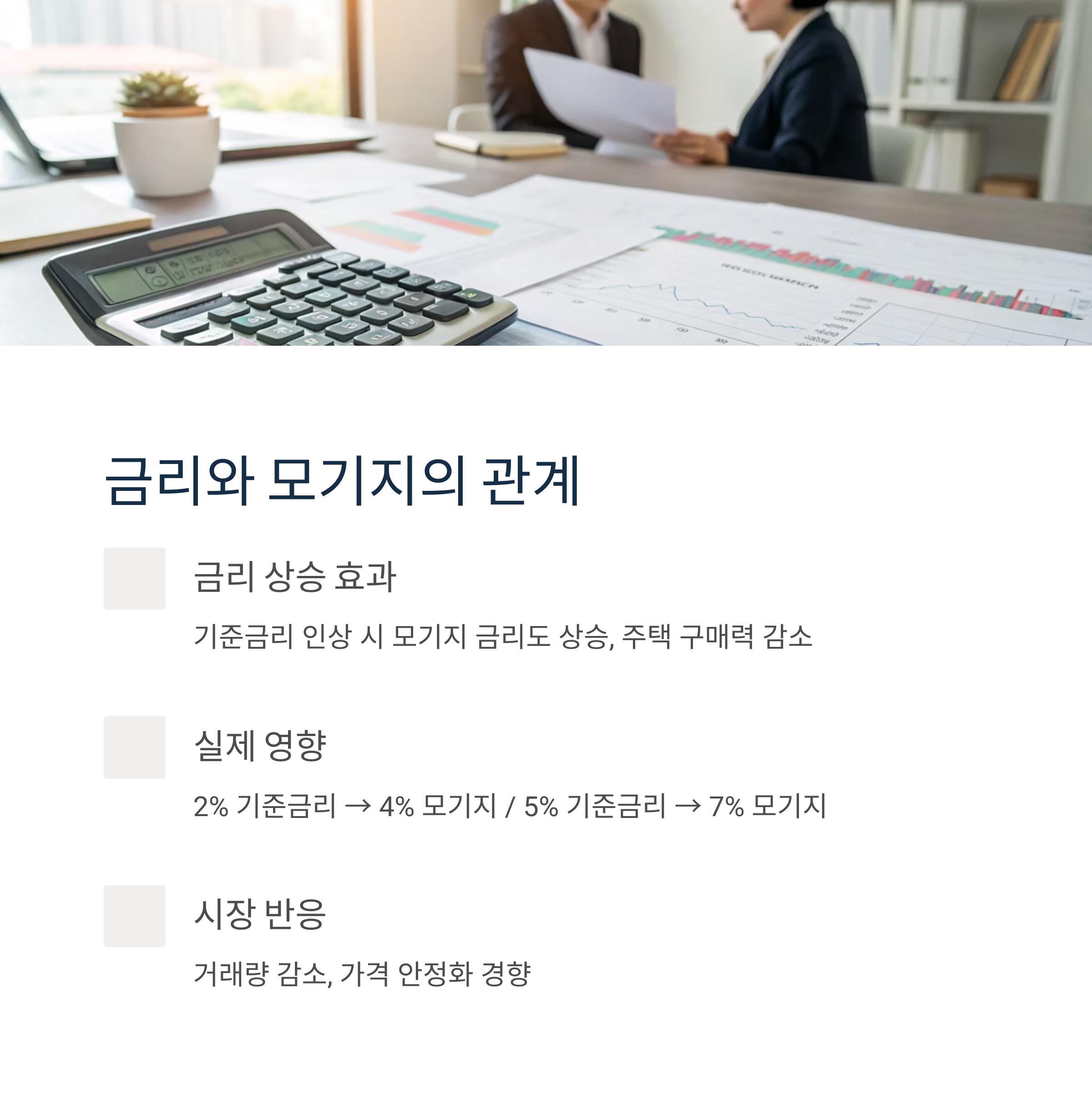 기준금리가 올라가면 대출이자와 모기지 금리도 상승하게 되어, 자연스럽게 주택 구매 여력이 감소하게 됩니다.