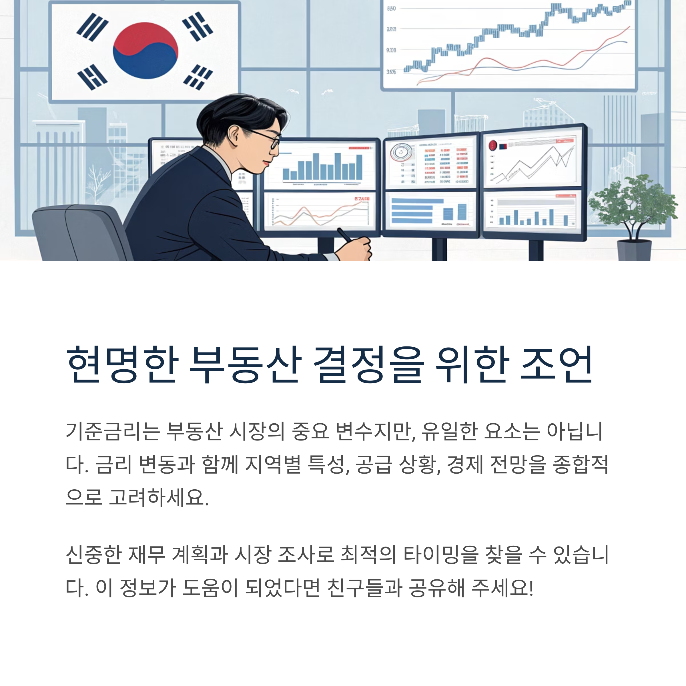 기준금리 인상은 부동산 시장과 경제 전체의 건강성을 보장하기 위한 정책으로 이해해야 합니다. 개인적으로 부동산 투자나 주택 구매를 고려 중이라면, "금리 변동" 외에도 다른 여러 요인을 함께 고려하는 것이 중요합니다.