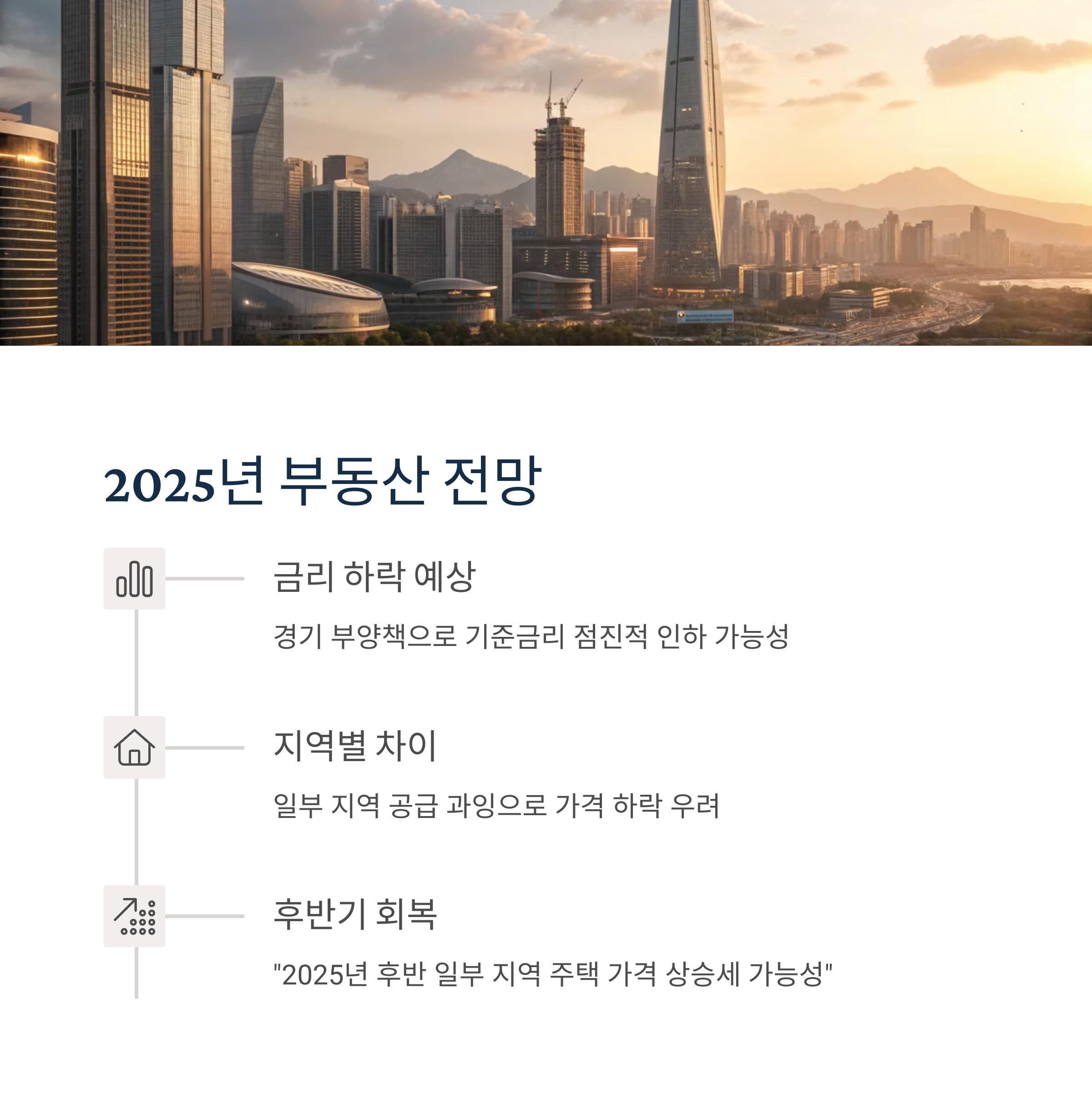 그러나 동시에 공급 과잉과 같은 지역별 특정 이슈는 가격 하락을 초래할 수 있습니다. 전문가들은 "2025년 후반에 일부 지역의 주택 가격이 다시 상승세를 탈 가능성이 있다"라고 언급하고 있습니다.