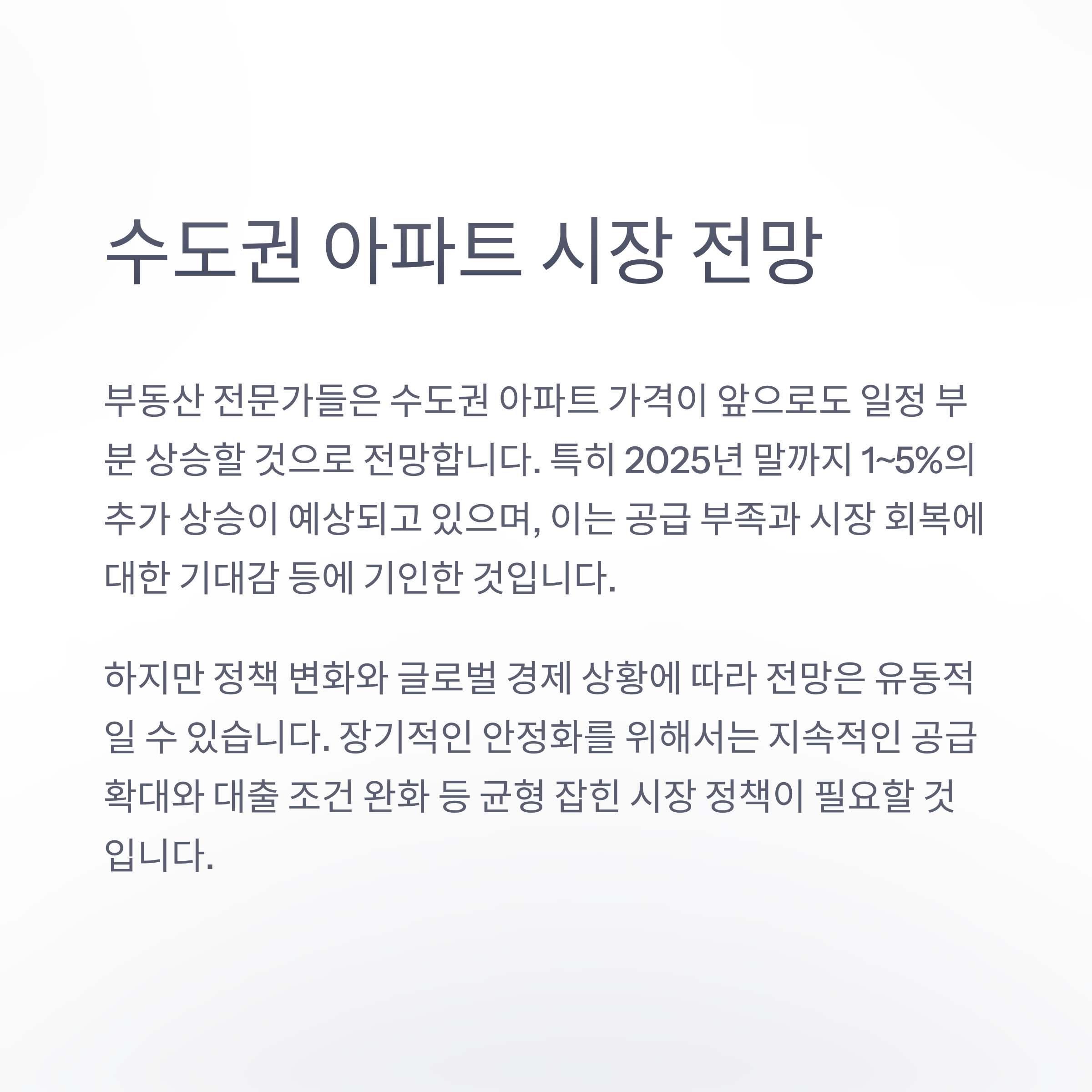 현재 수도권 아파트 시장은 다양한 요인의 상호 작용으로 인해 복잡한 흐름을 보이고 있습니다. 특히 공급 부족과 금리 인하, 정책 변화 같은 주요 요인이 상승세를 견인하고 있지만, 장기적인 안정화를 위해서는 지속적인 공급 확대와 대출 조건 완화 등 균형 잡힌 시장 정책이 필요할 것입니다.