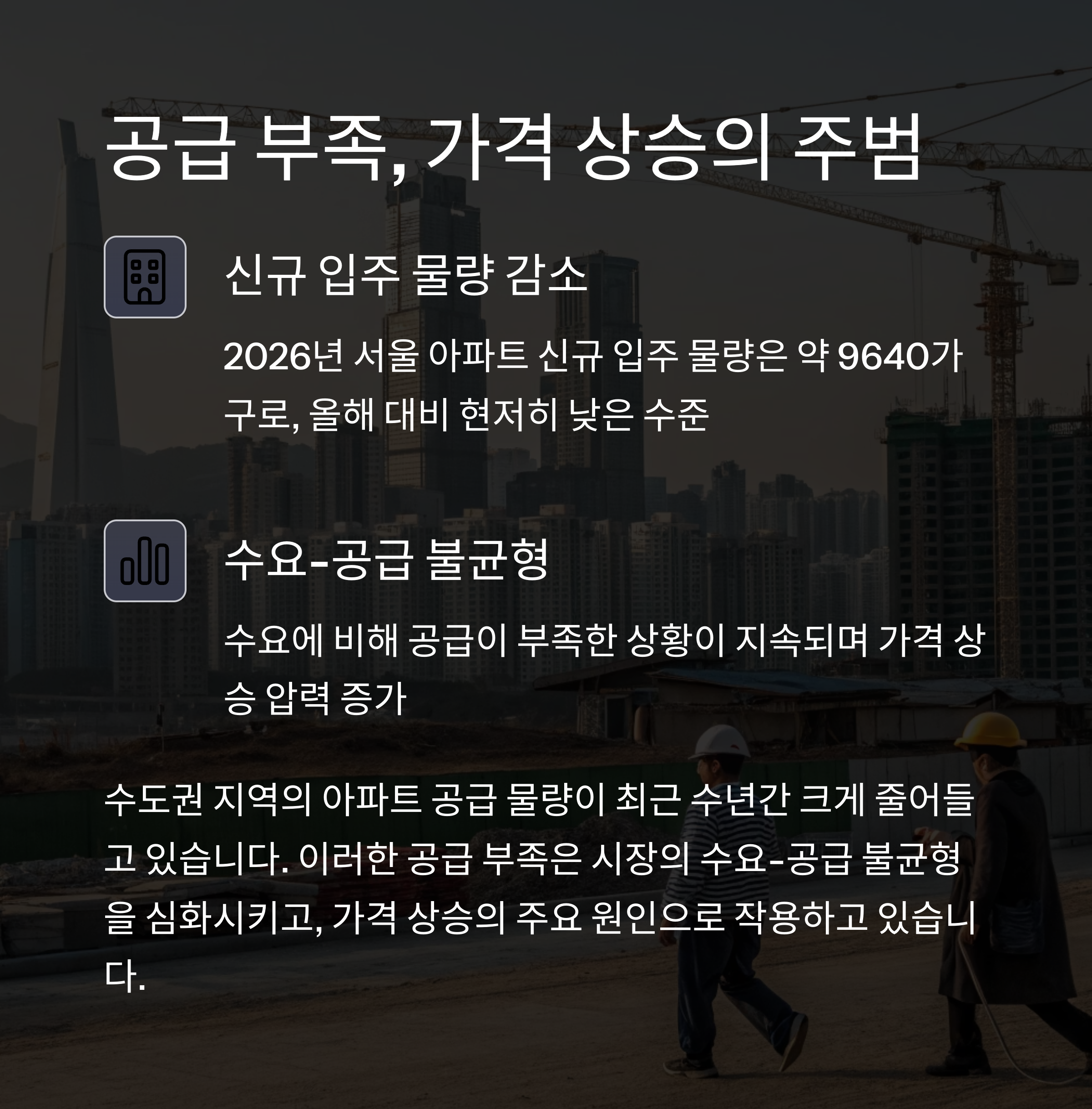 최근 수년간 수도권 지역의 아파트 공급 물량이 크게 줄어들고 있습니다. 특히 2026년 예정된 서울 아파트 신규 입주 물량은 약 9640 가구로, 이는 올해 2025년 대비 현저히 낮은 수준입니다. 이러한 공급 부족은 시장의 수요 대비 공급 불균형을 심화시키고, 가격 상승의 주요 원인 중 하나로 작용하고 있습니다.