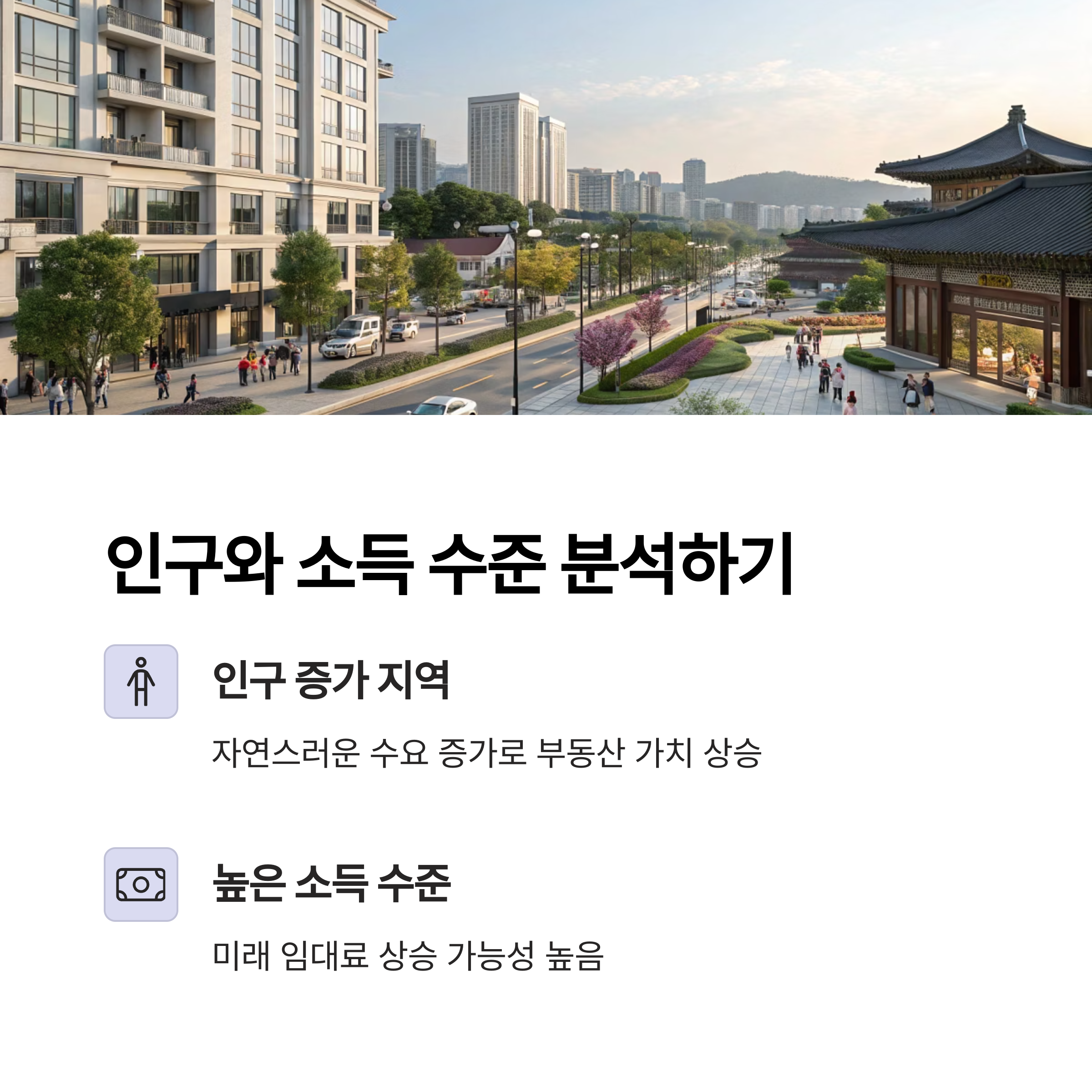 부동산의 가치는 해당 지역의 인구수와 소비력에 큰 영향을 받습니다. 인구가 증가하는 지역은 자연스럽게 수요가 증가하며, 이는 향후 부동산 가치를 상승시키는 주요 요인이 됩니다. 특히 소득 수준이 높은 지역은 미래 임대료 상승 가능성도 높아, 수익률 면에서 유리할 수 있습니다. 따라서 인구 변화와 소득 자료를 확인한 뒤 위치를 선택하는 것이 중요합니다.