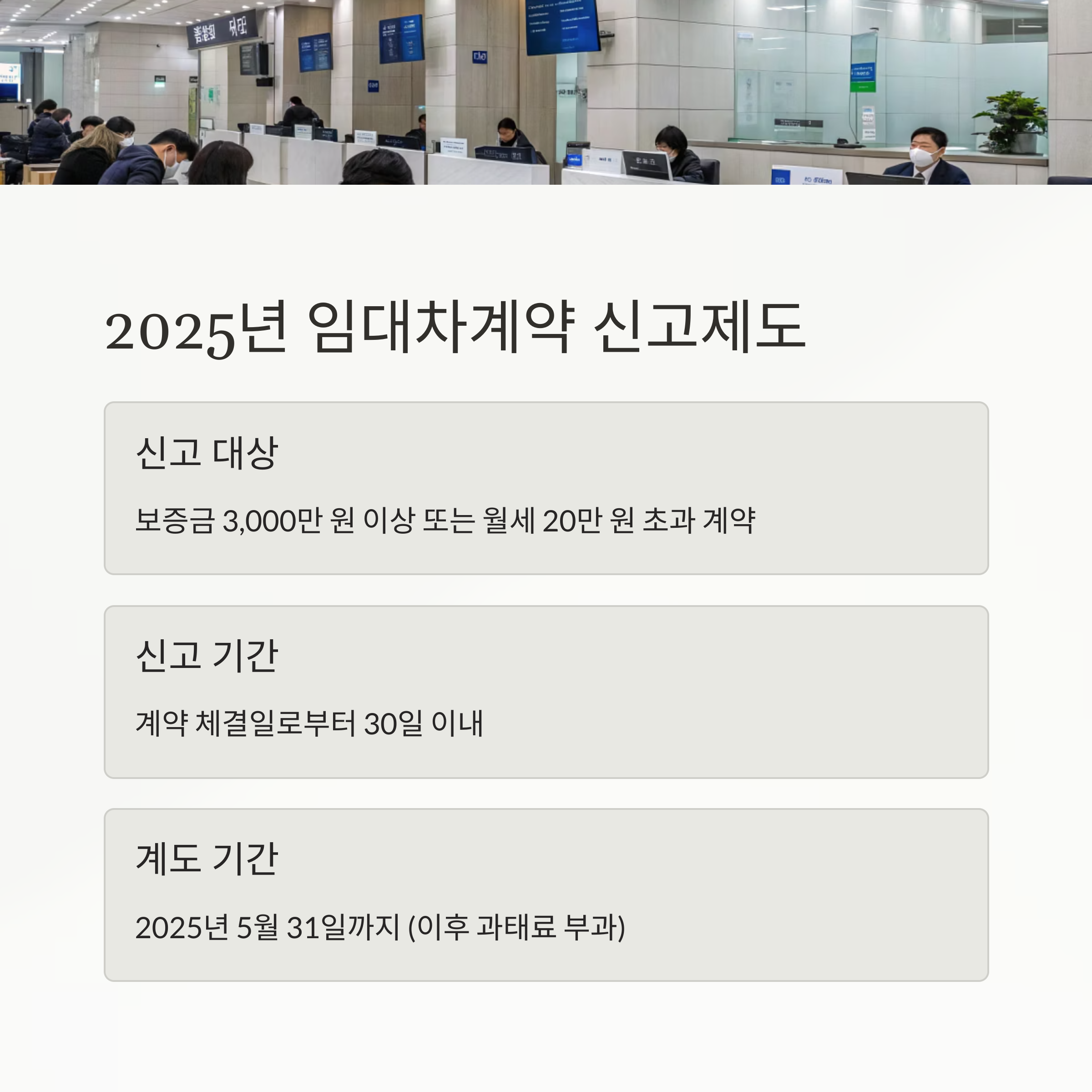 | 신고 대상 | 보증금 3,000만 원 이상, 월세 20만 원 초과 |