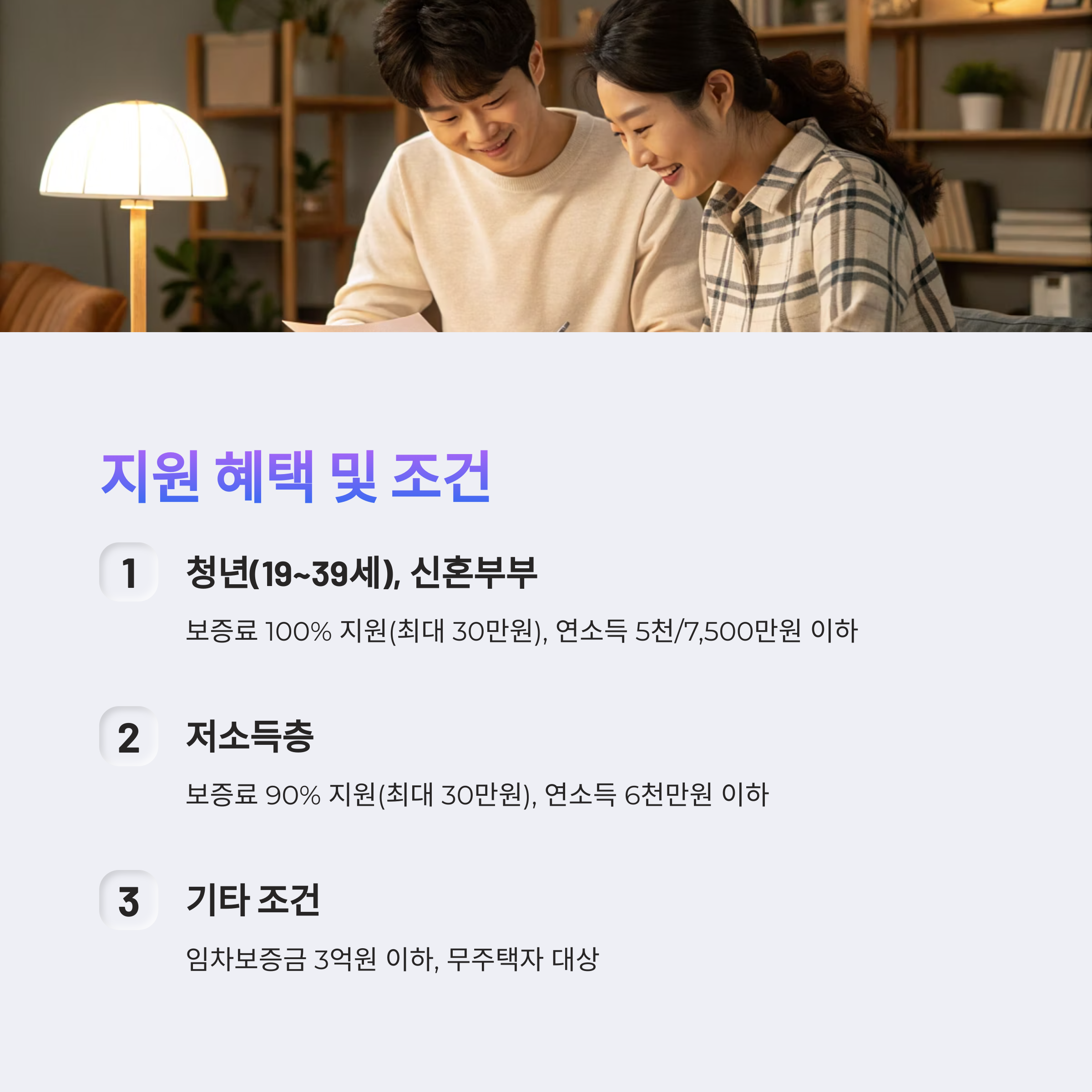 | 청년(19~39세), 신혼부부 | 보증료 100% (최대 30만 원) | 연소득 5천/7,500만 원 이하 |
