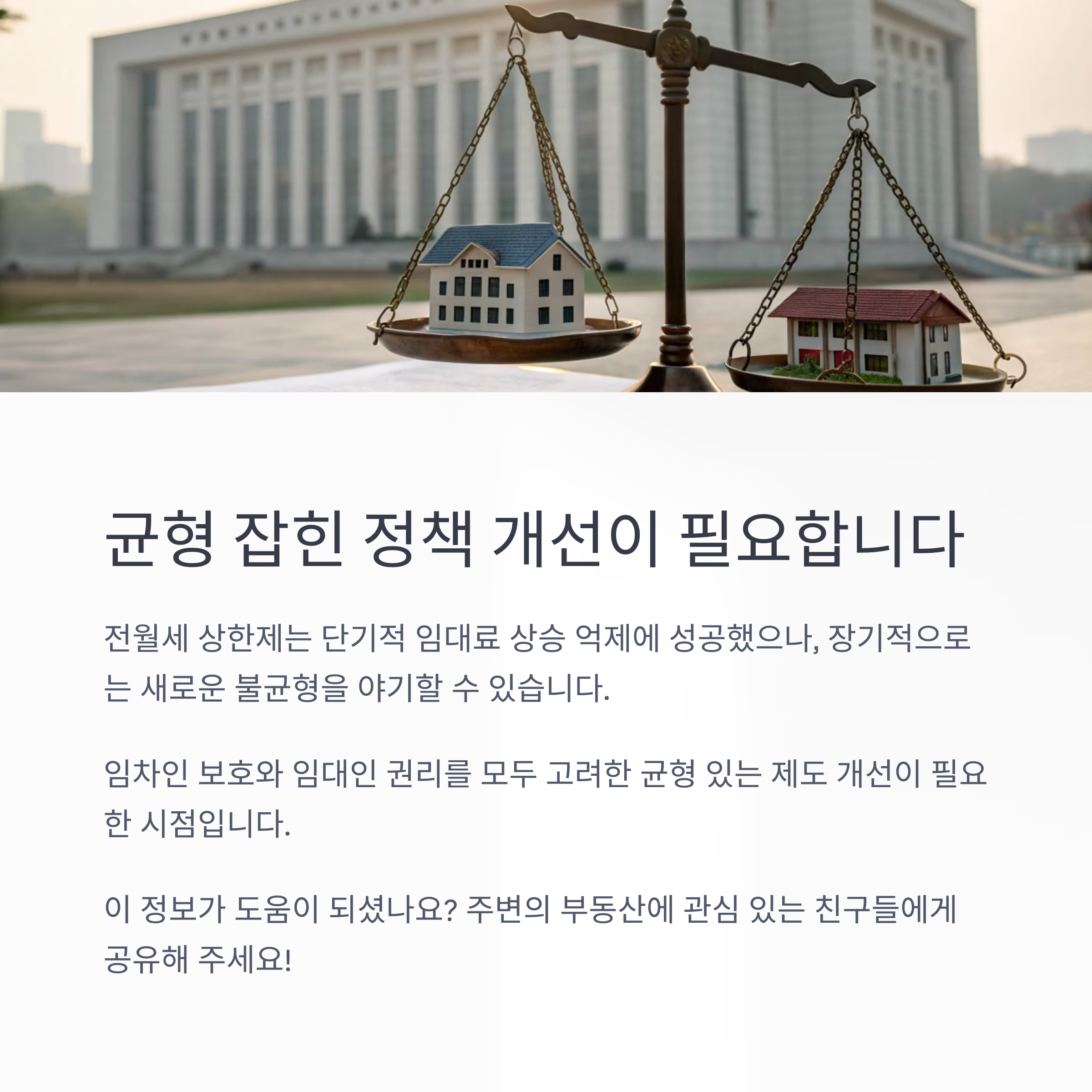전월세 상한제는 단기적으로 임대료 상승을 억제하는 데 성공했지만, 장기적으로는 새로운 불균형 문제를 야기할 가능성이 큽니다. 특히 임차인들을 실질적으로 보호하되, 동시에 임대인의 권리도 보장할 수 있는 균형 있는 제도 개선이 필요합니다. 지속적인 시장 모니터링과 데이터를 기반으로 한 정책 조정이 필수적입니다.
