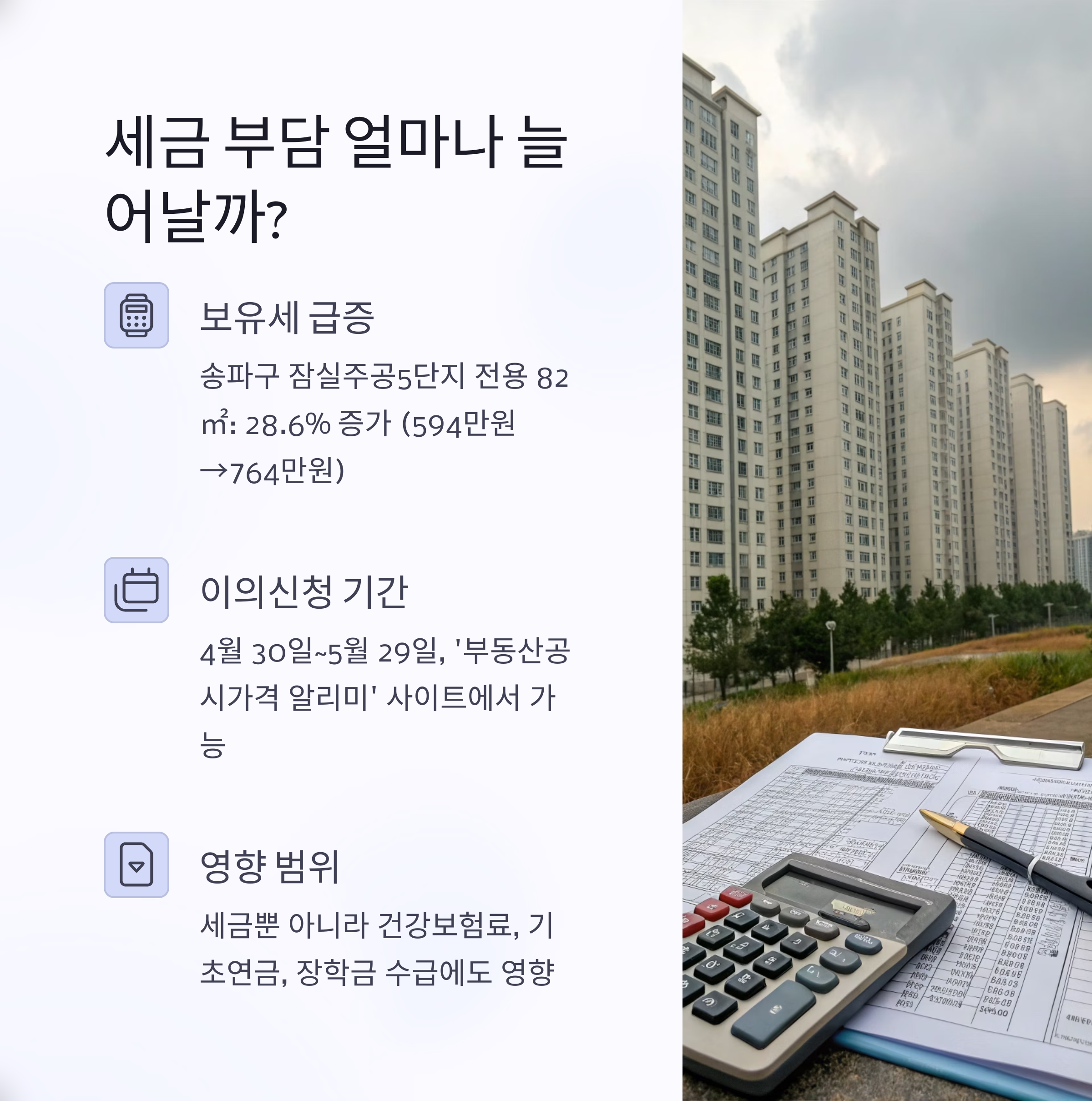 공시가격이 오르면 당연히 보유세 부담도 증가하겠죠. 특히 고가 주택이 많은 지역은 상승폭이 더 크게 느껴질 수 있어요. 예를 들어 송파구 잠실주공 5단지 전용 82㎡의 경우, 올해 보유세는 약 764만 원으로 추정되며 전년 대비 무려 28.6% 증가했어요. 이 정도면 세금으로 한 달 월급이 날아가는 느낌이죠.